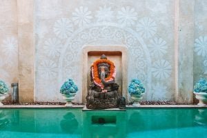 Di lokasi yang tampak dari bunga warna-warni yang beragam dan patung Dewa Ganesha yang dipercantik dengan kolam kebiruan – bak oasis ditengah hiruk pikuk keramaian Seminyak.