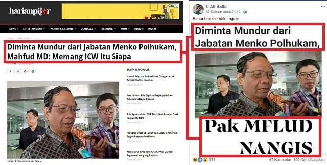 Penyebar hoaks menggunakan foto itu dari situs harianpijar.com pada artikel berjudul “Diminta Mundur dari Jabatan Menko Polhukam, Mahfud MD: Memang ICW Itu Siapa?”. Si pembuat hoaks mengganti judul pada artikel itu menjadi “Diminta Mundur Dari Jabatan Menko Polhukam, PAK MFLUD NANGIS“.