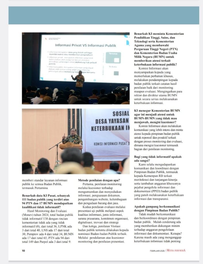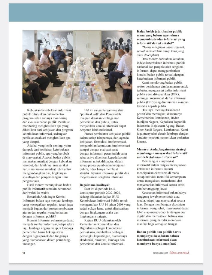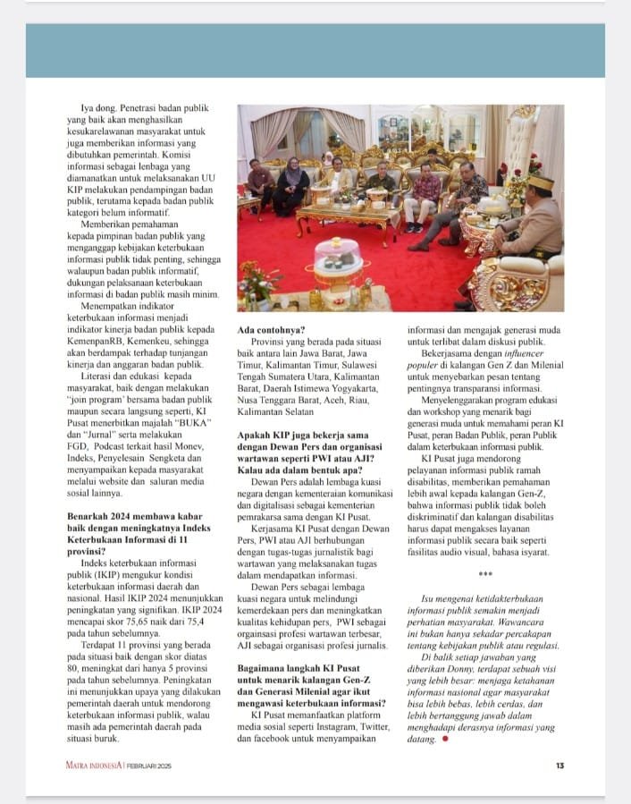MATRANEWS.id — Wawancara Ketua Komisi Informasi Pusat Republik Indonesia (KIP RI) Dr. Ir. Donny Yoesgiantoro, M.M., M.P.A., di majalah MATRA edisi cetak Februari 2025 bisa didapat di GRAMEDIA DIGITAL, klik ini atau My Edisi klik ini