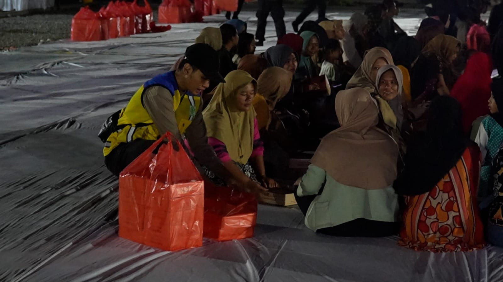 Kegiatan diawali doa bersama. Setelah itu, nasi dengan lauk daging dan udang dibagikan. Menu yang barangkali biasa di meja makan, namun di huntara terasa istimewa. Bagi anak-anak, ia menjadi cerita yang akan diingat.
